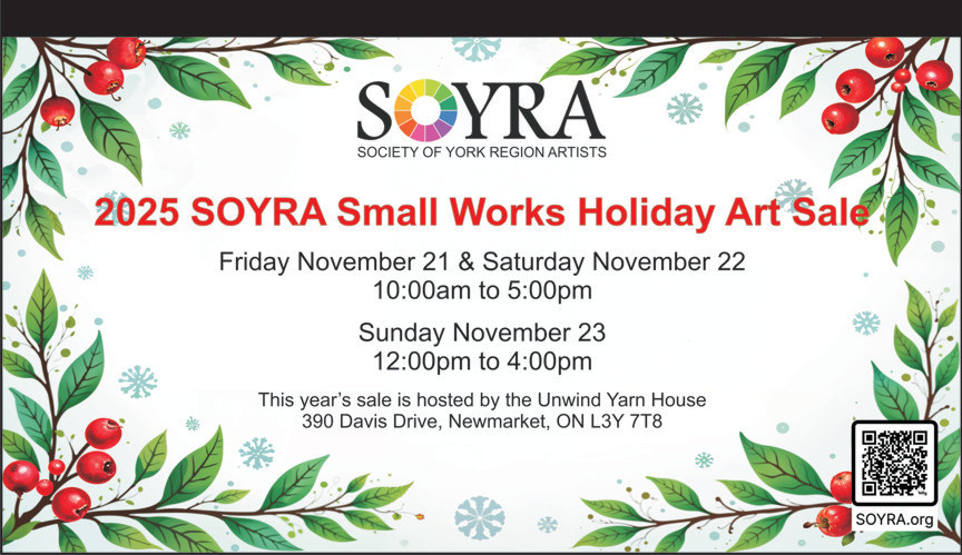 Read more...The Society of York Region Artists (SOYRA) presents their Annual Holiday Smallworks Art Show. Come out and connect with some amazing art. The artwork is no larger than 12" making them perfect for gifts or for yourself. There will be artworks in oil, acrylic, watercolour, mixed media and more.