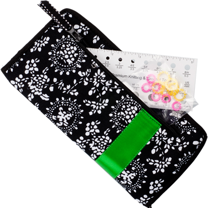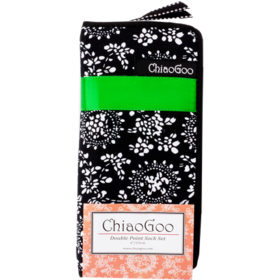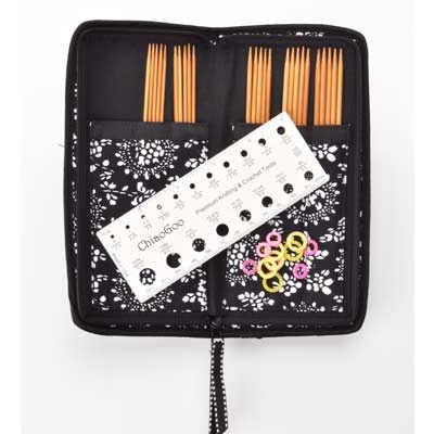 This Bamboo Double Point Sock Set includes five sets of 6" (15 cm) patina double points in sizes 2.25 mm, 2.5 mm, 2.75 mm, 3.0 mm & 3.25 mm, 12 stitch markers, a 5" (13 cm) needle gauge, and a compact, zipper-enclosed, fabric case with an outside, zippered pocket.