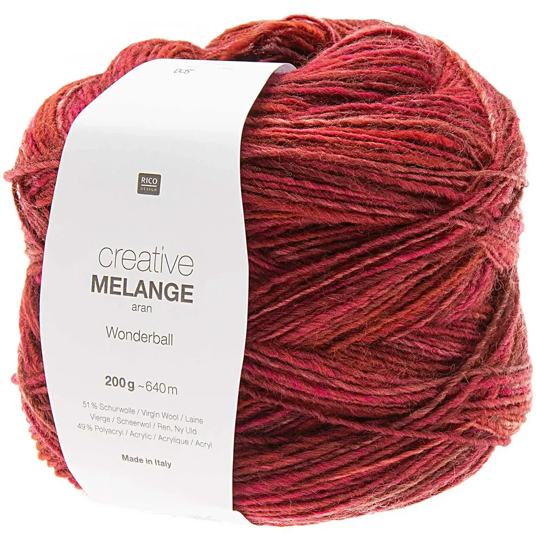 Looking for a colourful new project? Rico's Creative Melange Wonderball Aran is an eye-catcher. Each generous 200g ball unfurls in attractive colour gradients.