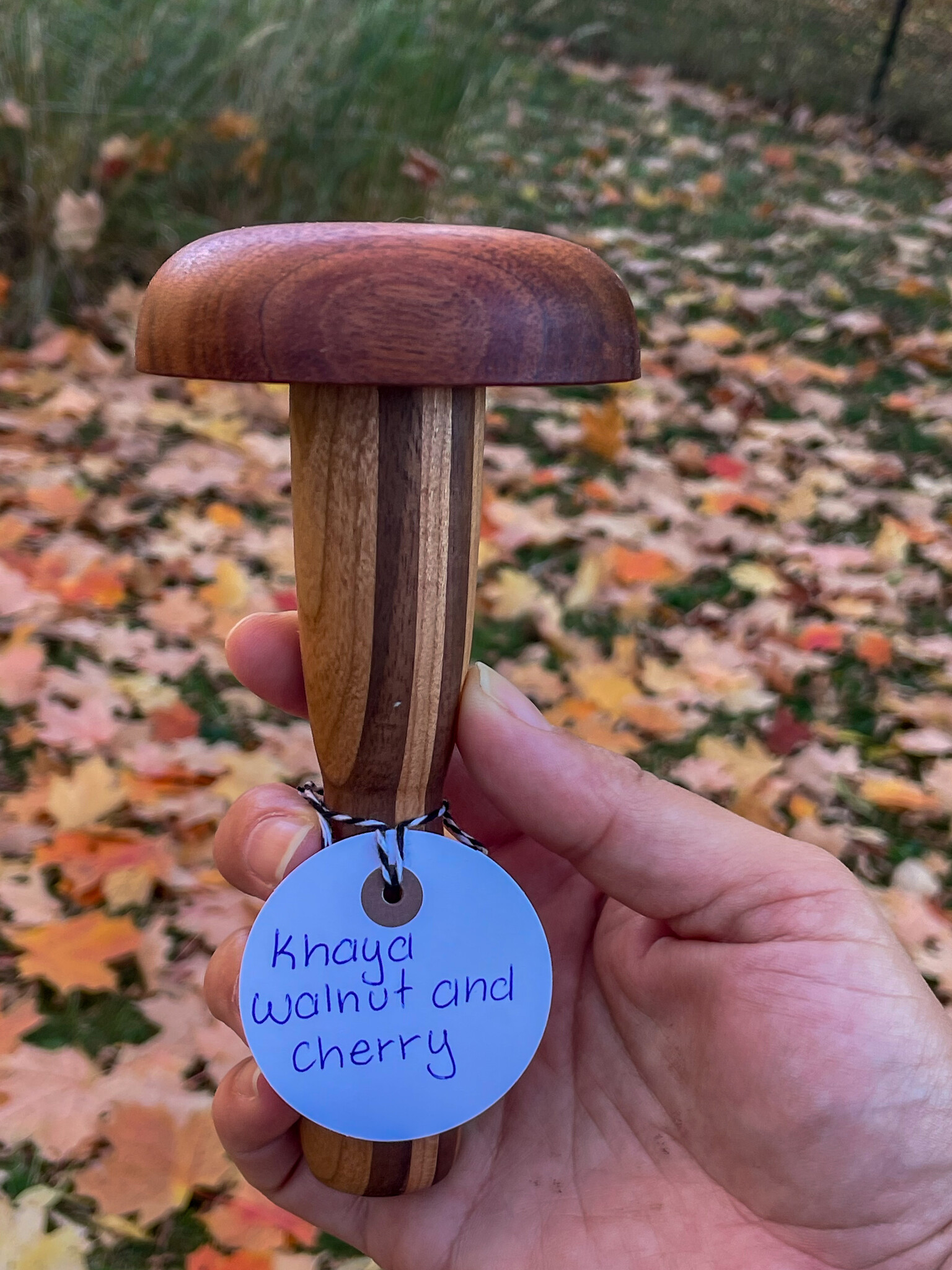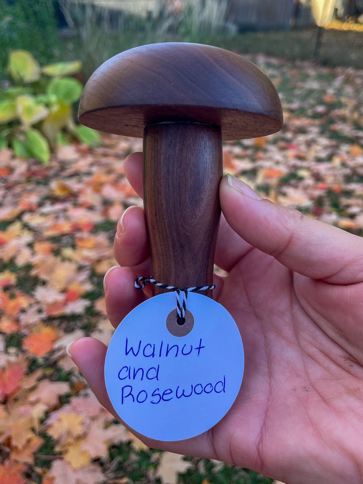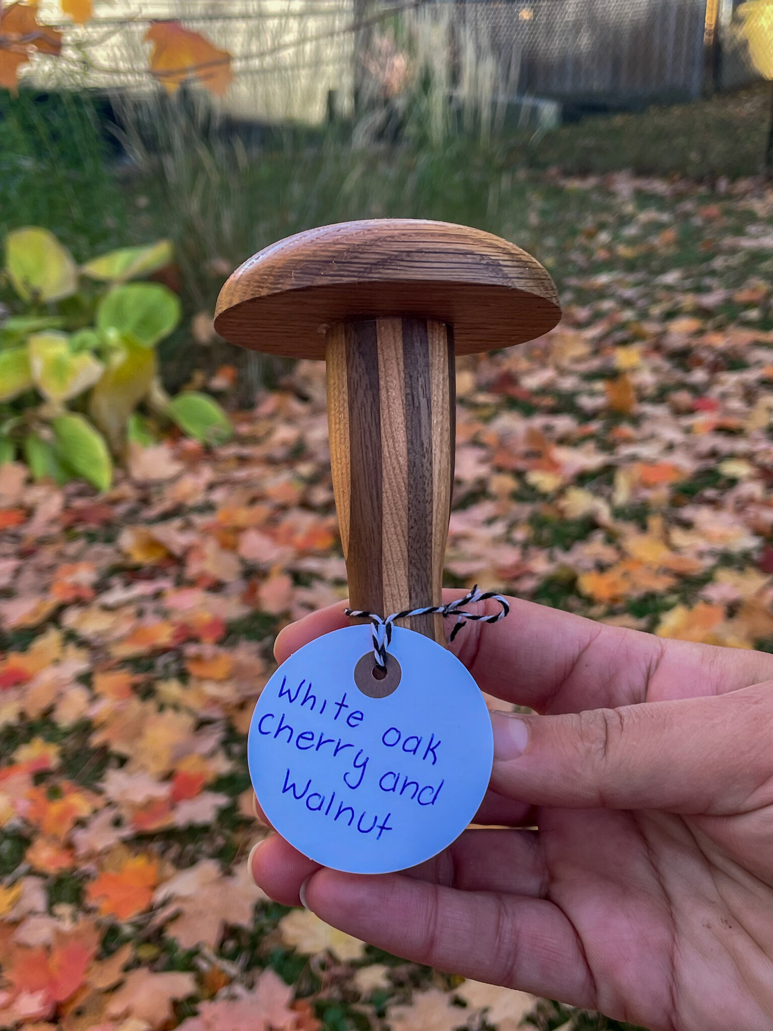 These darning mushrooms are all handmade by a local teen, Priya. She includes the type of wood used on the labels of each mushroom.