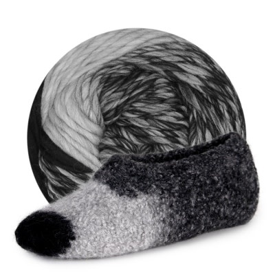 With Slipper, you can knit a matching pair of slippers from one ball of yarn. Each ball contains two repeats of a colour transition that makes a contrasting toe and foot, followed by a blend of the two shades for the heel and cuff. When the slippers are completed, simply felt them in the washing machine to create the perfect pair.