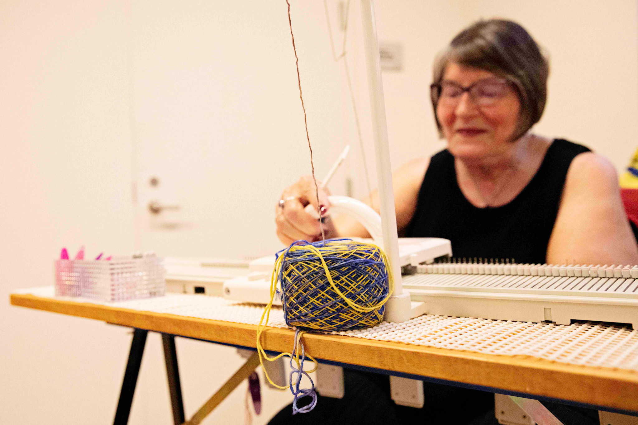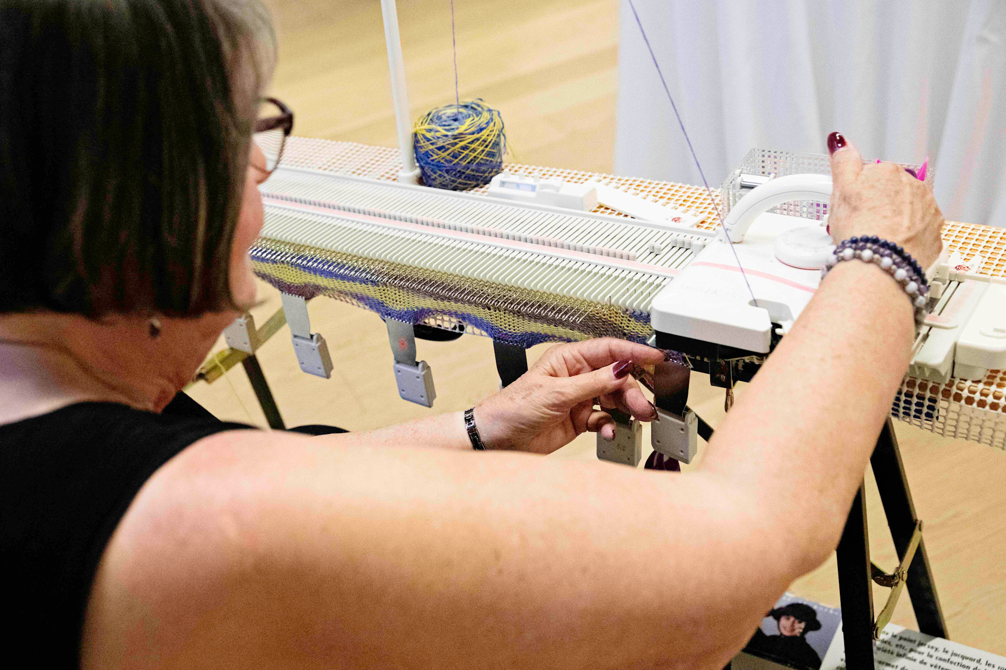 A knitting machine is set up for live demonstrations, and participants are encouraged to ask questions and request specific techniques to see in action.