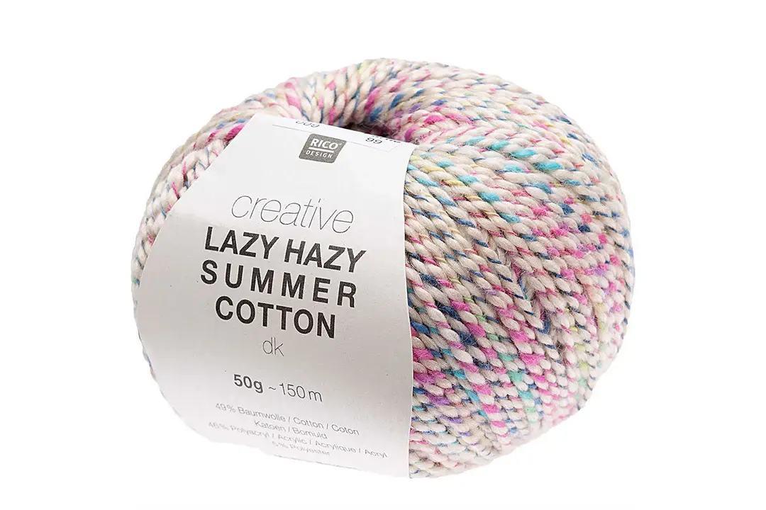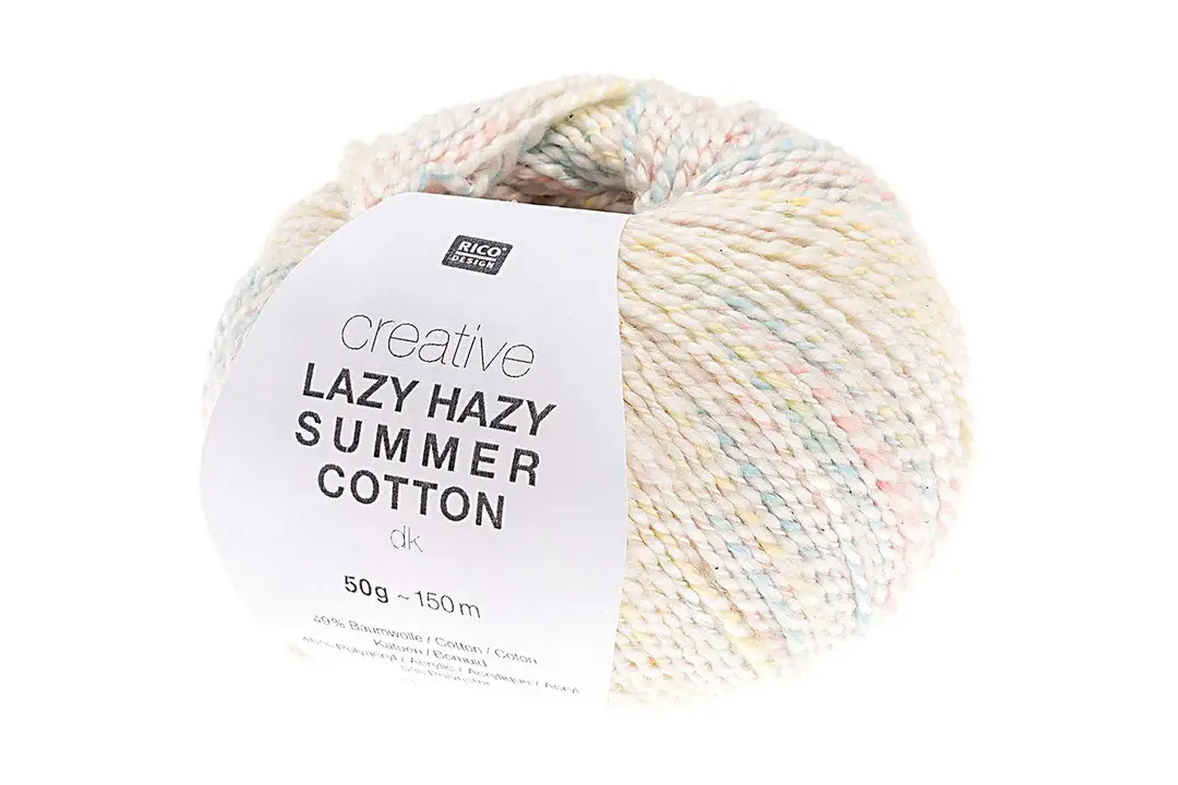 Creative Lazy Hazy Summer Cotton DK is a special yarn which has a solid core colour wrapped with an additional print coloured thread. This twisted thread looks absolutely stunning in knitted clothes or accessories. The yarn is available in a range of shades from pastels to bright bold colours.