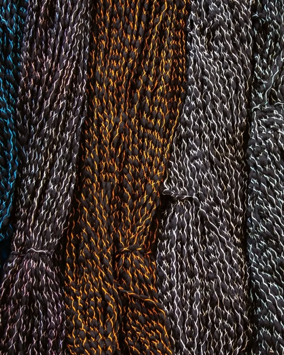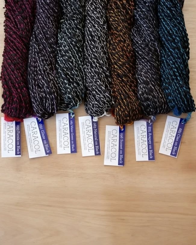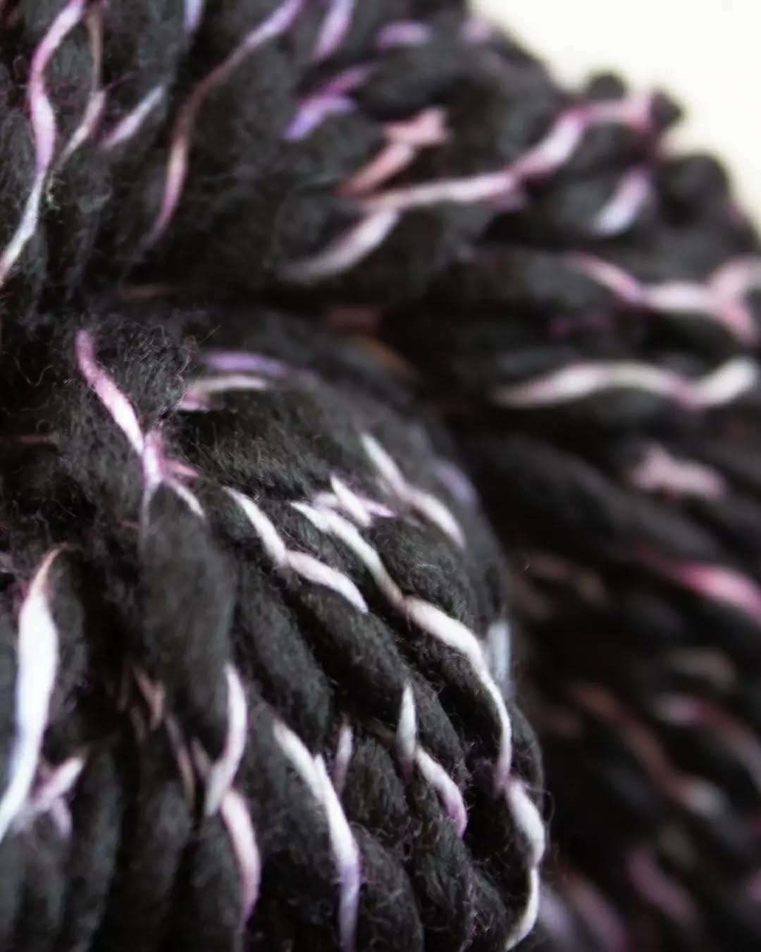 It starts with a bulky, black thick-and-thin single made of Malabrigo's delightfully soft superwash merino wool, and then it's criss-crossed with hand-dyed binder thread. Caracol knits up into a cozy, fluffy fabric with a ton of texture and visual interest.
