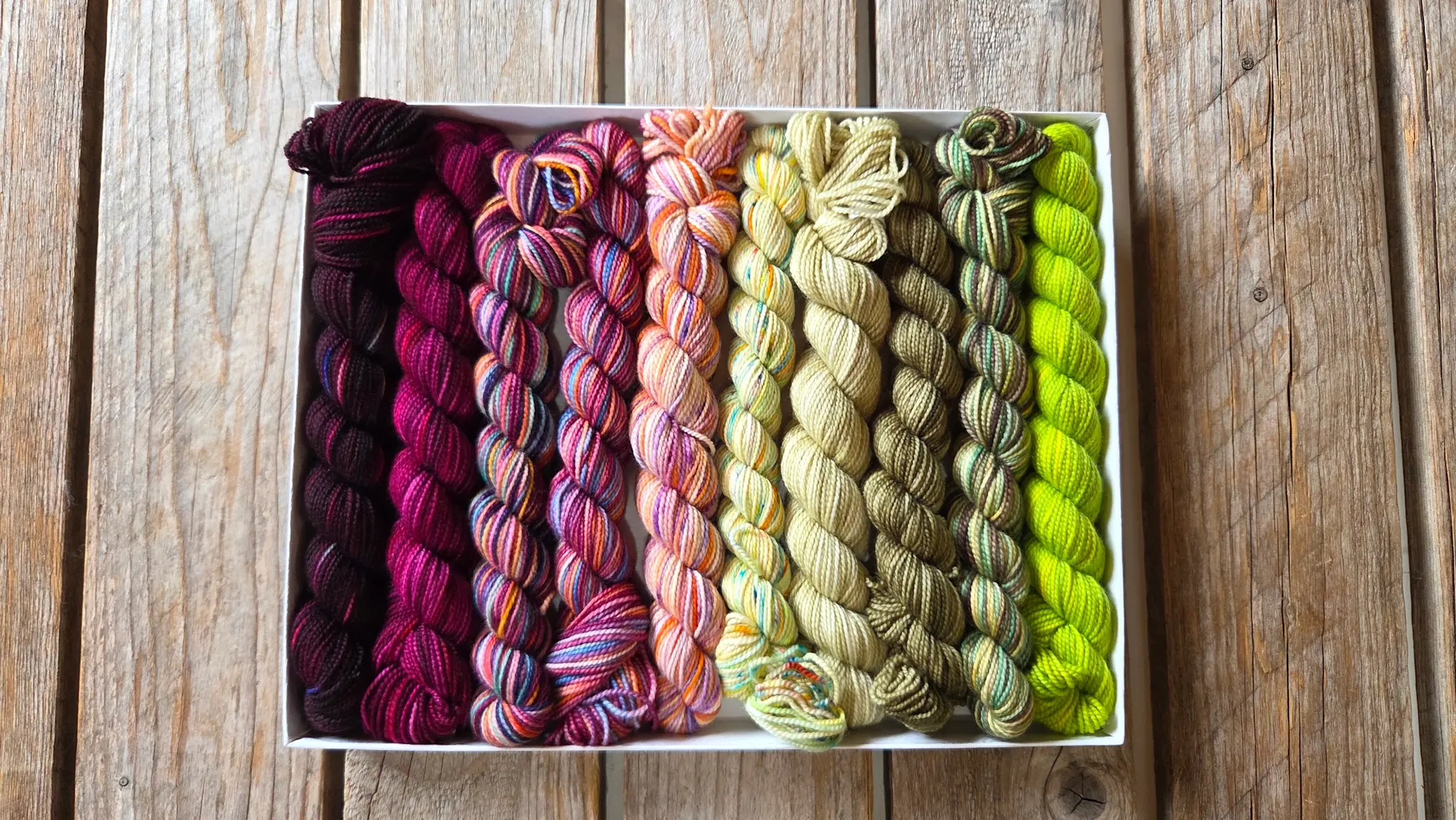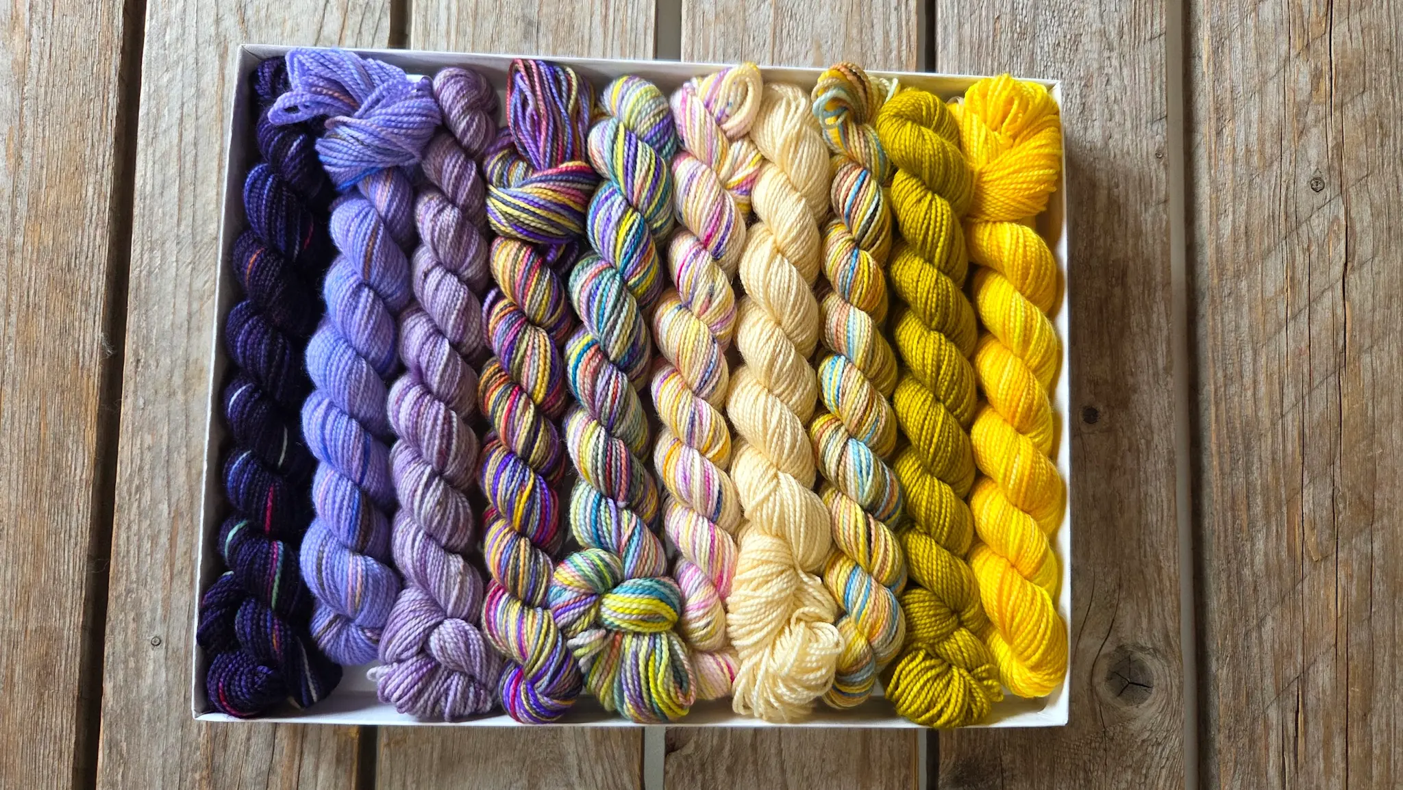 Each Pencil Set contains ten hand-dyed mini skeins of Koigu Painter's Palette Premium Merino (KPPPM). Koigu's Merino wool is an ultrafine fibre, silky smooth and tightly plied for durability.