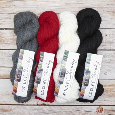 This kit contains 5 skeins of Estelle Chunky (2 skeins of Nickel Heather, and 1 each of Merlot, Black and Snow), and comes packed in a clear bag with a printed sheet showing the finished sweater, with a QR code to link to the pattern which can be purchased on Ravelry.