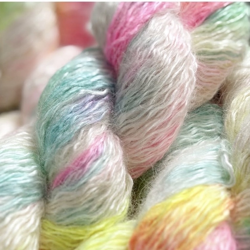 A single ply of shiny silk wrapped with a strand of fluffy Baby Suri Alpaca and polyamide to create a unique yarn with luxurious drape. Despite the textured (one might say squiggly, ha, ha) appearance of the yarn in the skein, it knits up into a smooth fabric with drape and a soft halo.